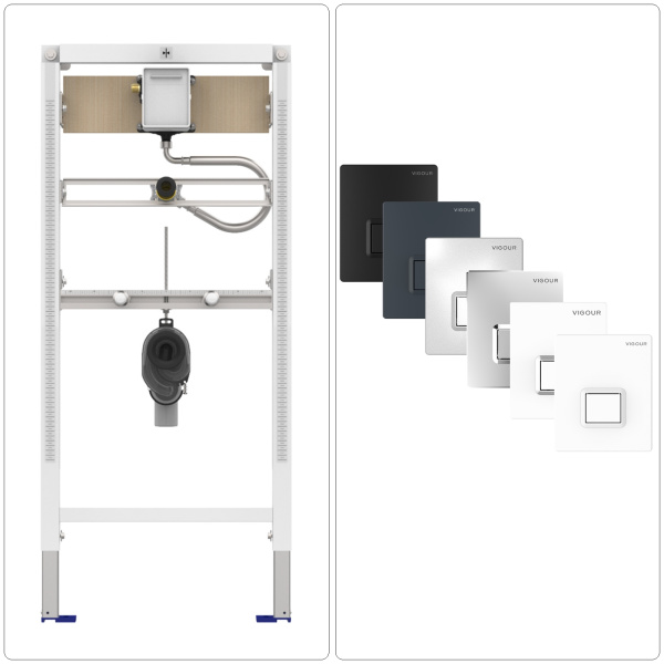 Das CONEL Urinal Vorwandelement ist eine universell einstellbare Komplettlösung für die moderne Urinalinstallation. Das robuste, selbsttragende Stahlrahmengestell eignet sich für viele gängige Urinalkeramiken und bietet durch flexible Befestigungspunkte und Tiefenverstellung einen einfachen, sicheren Einbau. Das Set ist auch für Infrarot-Elektronik geeignet und beinhaltet einen geruchshemmenden Absaugverschluss sowie sämtliches Anschluss- und Befestigungsmaterial. Die enthaltene VIGOUR TEES Betätigungsplatte (in verschiedenen Farben wählbar) sorgt mit ihrer flachen Bauweise und handbetätigten Drucktaste für eine zuverlässige, pneumatische Unterputzspülung – unabhängig vom Wasserdruck.