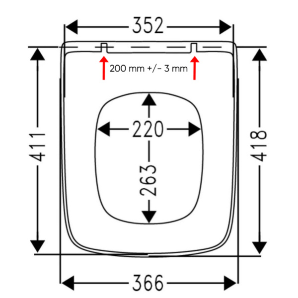 - Der Sitz hat einen Scharnierabstand von 200 mm (+/- 3 mm), damit passt er zu vielen VIGOUR DERBY WCs und vielen Standard-WCs – vor Kauf bitte Angaben am WC prüfen.